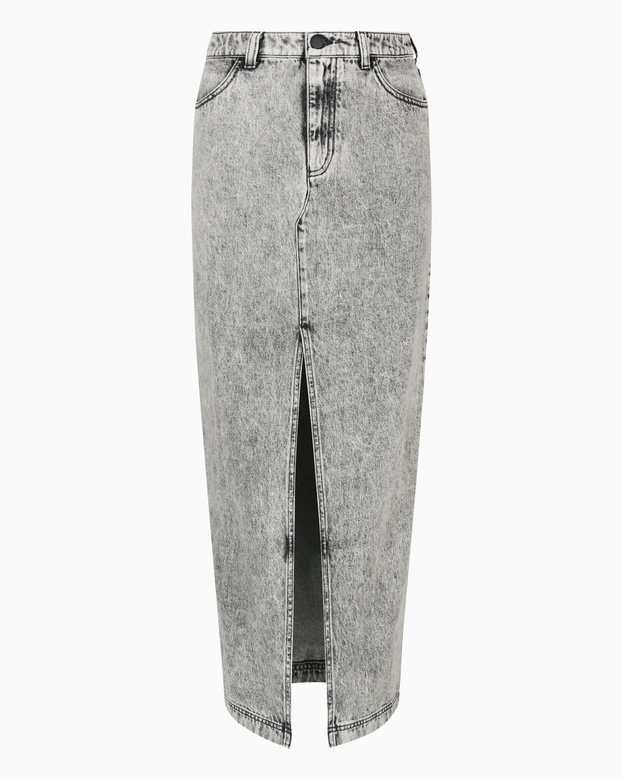Long split-front skirt in over-dyed organic-cotton denim made from organically farmed fibres. Emporio Armani maintains its focus on sustainability with the new Armani Sustainability Values (ASV) capsule collection, highlighting the need for a supply chain that is responsible and attentive to the resources of our planet. Named Black Blue, this futuristic collection takes us to a colour dimension that evokes distant, uncharted planets. The alternation of two key colours, blue and black, explodes in the Cosmos print, giving the entire collection a modern feel. The clothing is defined by atypical contrasting shapes: sometimes oversized for exceptional comfort and freedom of movement, and sometimes super skinny to enhance the silhouette with ultra-elongated lines. Hints of feminine colour harmoniously complete the blue-black pairing. The fabric is made of 100% organic cotton Length: 95 cm Organic denim Over-dyed Waist with belt loops Zip and button closure Side pockets Front slit Back patch pockets Back eagle plate< Product Code: 6D2NA22DUVZ0662
