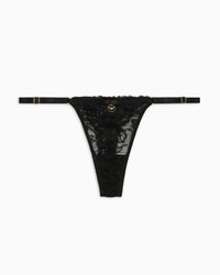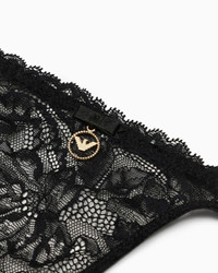 Lace thong made from certified recycled nylon, supporting circular, environmentally friendly production. Matching bow and logo medallion. Product Code: 1638264R206100020 Details Composition 87% Polyamide 13% Elastane The fabric is made of 56% recycled polyamide Lace Elasticated waist Logo medallion Fitting The model is 178 cm tall and is wearing size 40/S (Italian Size)