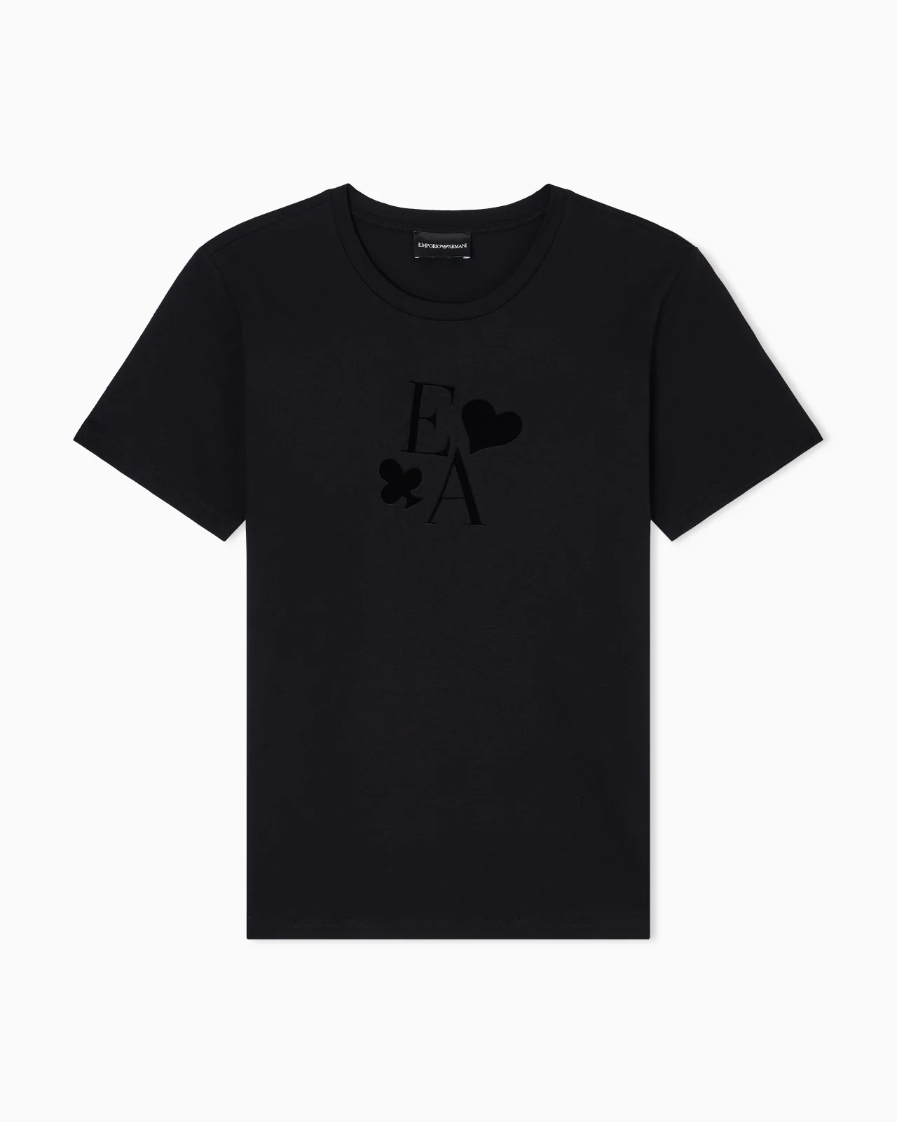 Short-sleeved crew-neck T-shirt made from pure cotton jersey. The style is embellished with the iconic EA logo print alongside the playing card suits created from a flocked fabric that gives a distinctive embossed effect with a velvety feel. The intriguing world of playing cards is the theme running through this season’s women’s collection. The Jeu de Cartes theme is playfully interpreted in different details of the collection: the elegance and refinement of Emporio Armani intertwine with the classic symbols of the playing-card suits, together with intense and vibrant colours that combined with softer shades create looks with a mysterious and sophisticated allure. Fabric: 100% organically-grown cotton Jersey Crew neck Short sleeves Flocked print Product Code: EW002840AF12597UC001