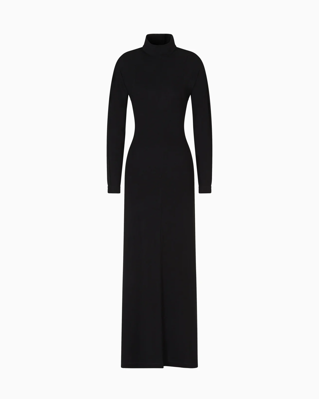 Mock-neck long dress made of viscose crepe interlock whose natural fluidity and lightness give the piece an ultra-feminine look that will add a touch of luxury to any outfit. Decorative buttons on the back add a modern touch to the style. The item is part of this season’s new Polygon capsule collection, where vertical lines and geometric cut-outs capture the essence of a modern, elegant design. An offering that exudes post-modernist vibes, creating a perfect balance between functionality and aesthetic harmony: structured and refined creations are developed in melange grey tones that go hand in hand with the warmest undertones of burgundy. Fabric: 96% viscose from responsible forestry Length: 150 cm Viscose crepe Mock neck Long sleeves Back closure with press studs Decorative buttons on the back Unlined garment Product Code: EW002698AF19052UC001