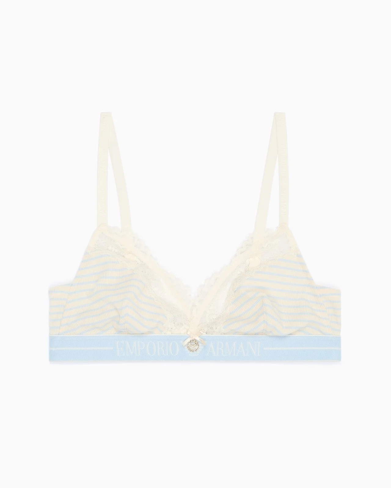 Triangle bra with adjustable shoulder straps. Ribbed, striped jersey fabric made from certified recycled polyester, supporting circular, environmentally friendly production. Lace details and logo underband. Triangle Jersey Rib-knit Lace details Adjustable shoulder straps Logo band Closure hooks Product Code: EW000510AF10885F1030