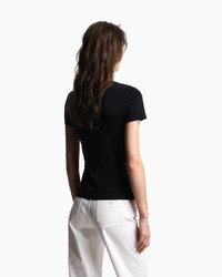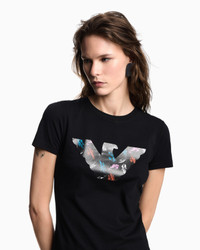Women’s cotton stretch jersey T-shirt. The iconic eagle logo, which has always been the hallmark of Emporio Armani, is still undoubtedly the essence of every piece, managing to elevate every garment with its simplicity. Here it takes centre stage embellished with an internal decorative pattern. Fabric: 95% organically grown cotton Slim fit Stretch jersey Crew neck Short sleeves Patterned print Product Code: EW000896AF12571MC334