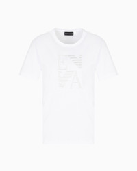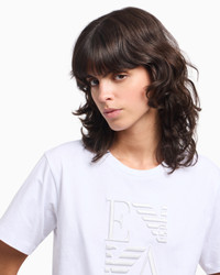 Organic cotton jersey crew-neck T-shirt. The style features an embossed, monochromatic oversized front logo embroidery. The piece belongs to the Winter Urbanism capsule collection, a selection that reinterprets the volumes and shapes of the winter wardrobe with an essential take. The urban spirit is expressed through clean, minimalist lines, enriched by the sophistication of the materials that are snug and warm to the touch. Fabric: 100% organic cotton Jersey Crew neck Short sleeves Matching oversized embroidered logo Product Code: EW002958AF12573U0002