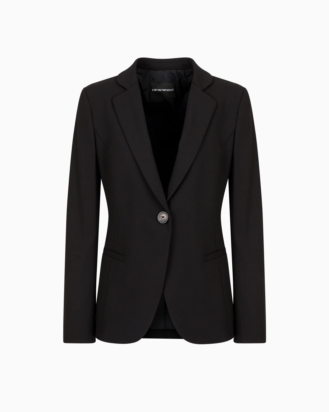 Single-breasted jacket made of stretch virgin wool Berethea fabric, with lapels on the neckline and closure with genuine horn buttons. Thanks to a classic, straight cut, this jacket can be worn everywhere, making it perfect on every occasion, from mornings at the office to after-work drinks. The piece belongs to the Essentials selection, the Emporio Armani capsule collection that makes a statement of enduring style: both elegant and practical, it works for numerous combinations on a wide array of occasions. The colour palette includes the brand’s characteristic neutral shades, combined with a minimalist design to create a series of key pieces for the female wardrobe. Product Code: 0NG3BT020021999 Details Composition 96% Virgin Wool 4% Elastane Barathea wool Lapel collar Horn button Long sleeves Cuffs with horn buttons Colour-matched lining Fitting The model is 178 cm tall and is wearing size 40/S (Italian Size)