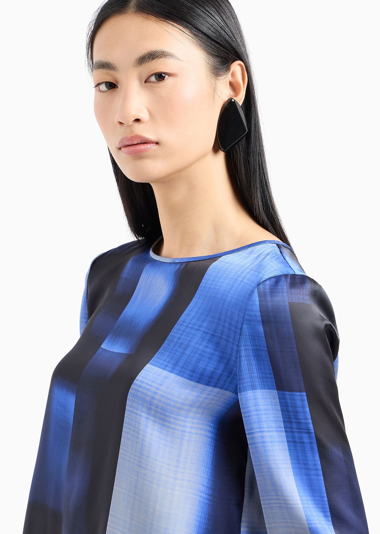 This elegant blouse with three-quarter sleeves is crafted from sleek, flowing satin and is made unique by an all-over print that plays with shades of blue to create chiaroscuro effects. Product Code: EW000292TE111761MB013 Details Composition 100% Polyester Satin All-over print Rounded neckline Three-quarter sleeves Back slash closure with covered button Unlined body Fitting The model is 178 cm tall and is wearing size 40/S (Italian Size)