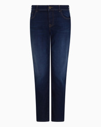 The modern style of these jeans, made of a stretch cotton and Lyocell blend denim, is enhanced by the mid-rise waist and slim, straight leg. Emporio Armani jeans are an undisputed choice in terms of style, perfect for showing off on any occasion. Slim fit. Slim fit Mid-rise waist with belt loops Five pockets Straight cut Zip and button closure Suede jacron with logo Laser-cut logo on the back Product Code: EW001499AF12677MB001