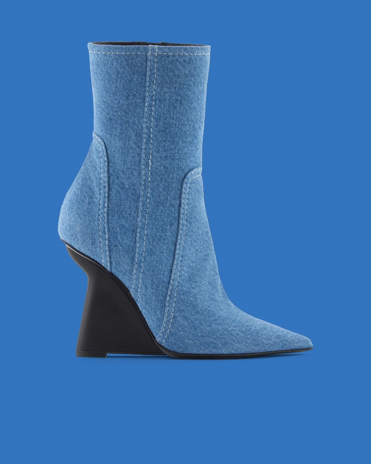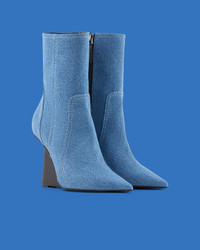 Tapered-toe ankle boots with washed denim uppers and a contoured wedge heel. Emporio Armani maintains its focus on sustainability with the new Armani Sustainability Values (ASV) capsule collection, highlighting the need for a supply chain that is responsible and attentive to the resources of our planet. Named Black Blue, this futuristic collection takes us to a colour dimension that evokes distant, uncharted planets. The alternation of two key colours, blue and black, explodes in the Cosmos print, giving the entire collection a modern feel. The clothing is defined by atypical contrasting shapes: sometimes oversized for exceptional comfort and freedom of movement, and sometimes super skinny to enhance the silhouette with ultra-elongated lines. Hints of feminine colour harmoniously complete the blue-black pairing. Product Code: X3N189XD439100005 Details Composition 100% Cotton Wedge height: 10.5 cm Denim upper Pointed toe Internal side zip closure Contoured wedge Made in Italy