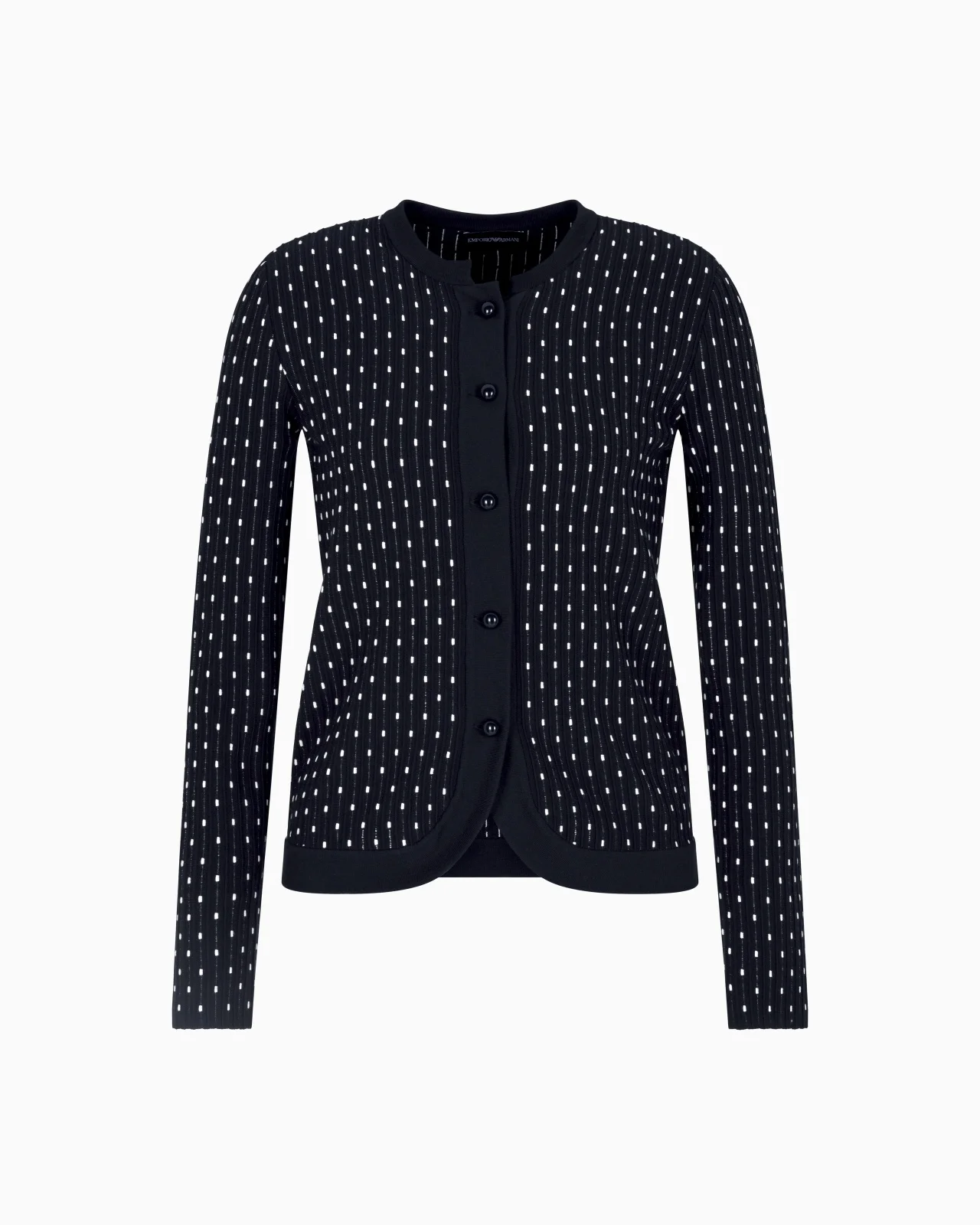 Cardigan with front button placket, made from a viscose blend in a ribbed-effect knit. The style is distinguished by an all-over jacquard that creates a unique polka-dot motif that adds prestige and identity to the piece. Plain knit Loose knit between ribs Jacquard Polka-dot motif Front buttoning Long sleeves Rounded hemline Product Code: EW002682AF19366FB017