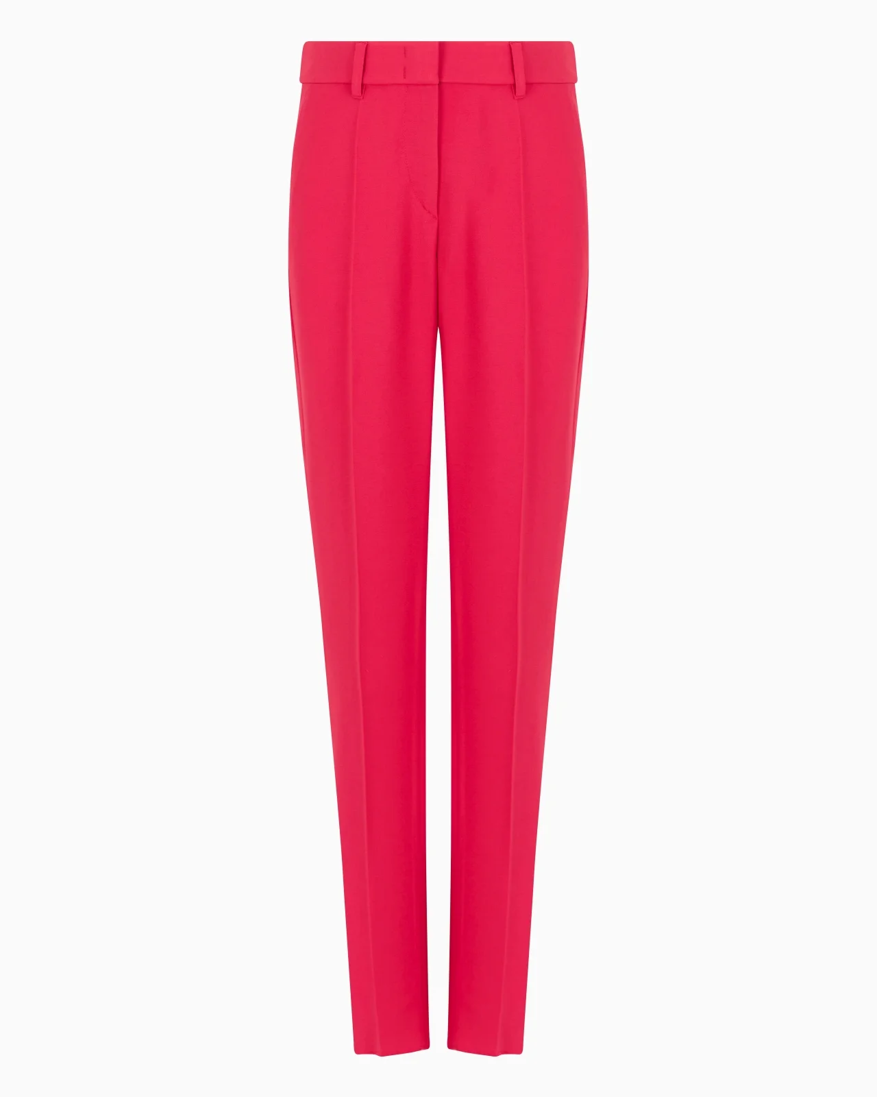 Cady crepe trousers with stitched crease on the leg and belt loops at the waist. This item is defined by Emporio Armani’s distinctive allure, making it perfect for all everyday activities, both formal and casual. Product Code: 0NP08T020131U4169 Details Composition 50% Viscose 47% Acetate 3% Elastane Cady crepe Waistband with belt loops and satin lining Front ribs Closure with zip, hook and back button Side pockets Back welt pocket Unlined garment Ankle cuffs: 17 cm Fitting The model is 178 cm tall and is wearing size 40/S (Italian Size)