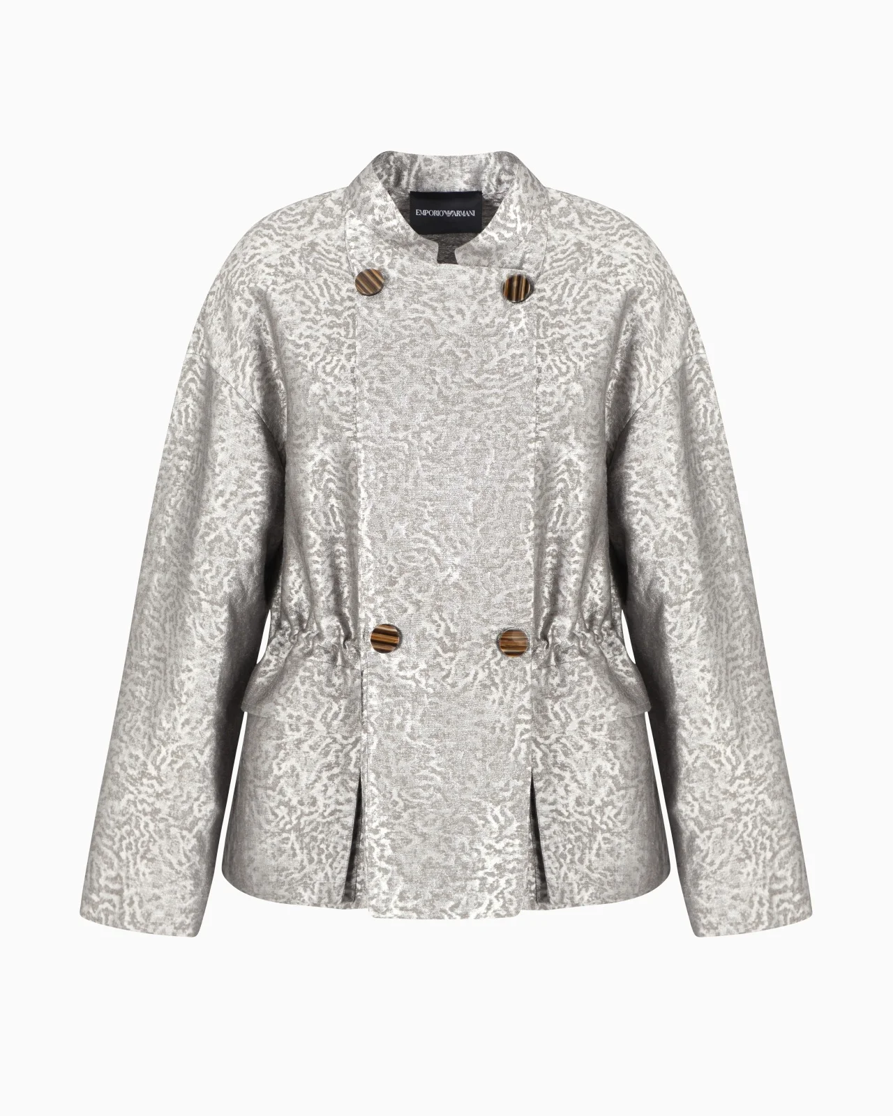 Jacket with iconic guru collar, made of a linen and viscose blend that feels particularly smooth thanks to a percentage of silk in the main fabric. The style features jacquard with a camouflage motif: a pattern with a classic urban appeal that adapts to everyday wear. Inspired by the typical design of safari jackets, it features a drawstring that accentuates the waist, side patch pockets and closure with marble-effect press-studs. Linen blend Guru collar Closure with marble-effect press-studs Long sleeves Side patch pockets with flap Drawstring waist with internal pull tabs Satin lining Product Code: EW001731TE13519F8026