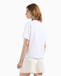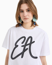 Stretch cotton jersey, crew-neck T-shirt. The piece is made recognisable by the iconic Emporio Armani logo made of lurex that has an exclusive shiny look thanks to the sparkle of the fibres, enhancing the simple style Stretch jersey Crew neck Oversized lurex logo Side slits in the hem Product Code: EW001523AF12573U0002
