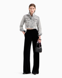 Cropped jacket made from cotton denim. The logo is not explicit, but still remains the decorative star: a storm of rhinestones designs a very dense pattern with an all-over EA logo, creating a myriad of bright, sparkling highlights. Product Code: 6D2B812DULZ10662 Details Composition 100% Cotton Denim All-over rhinestone logo Classic collar Front buttoning Logo buttons Front pockets with flap and button Matching stitching Leather tag at the back Fitting The model is 178 cm tall and is wearing size 40/S (Italian Size)
