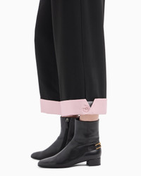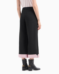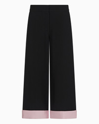 Cropped trousers made of cady crepe with contrasting fixed turn-ups on the grosgrain hem. The style with an elasticated waist at the back is a versatile piece for a classic yet modern look. Cady crepe Fastening with zip, press stud and back button Hem with grosgrain turn-up and button Elasticated waist at the back Product Code: EW001416TE10418UC001