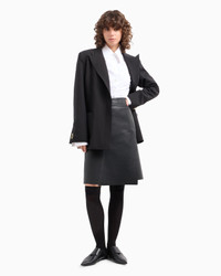 Skirt made of exquisite nappa lambskin with a particularly soft feel and raw cut edges. The symmetrical design features an off-centre closure on the left hip that adds distinction. The style is part of this season’s new Dawn to Dusk capsule collection, a selection of wardrobe essentials in a colour palette that takes inspiration from the golden light of dawn and the subtle shadows of sunset, creating a mix of warm and sophisticated tones accompanied by darker touches of shade.. A line designed to create a versatile wardrobe with pieces that lend themselves to being worn together to create layered looks, or matched to produce different creations that accompany you from morning to night. Length: 58 cm Nappa lambskin Wrap closure Inner press stud on the right side Diagonal inner zip and double press stud on the left side Asymmetric design Product Code: EW001753AF15392UC001