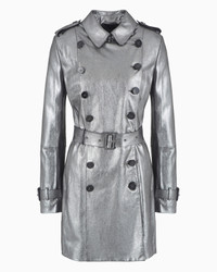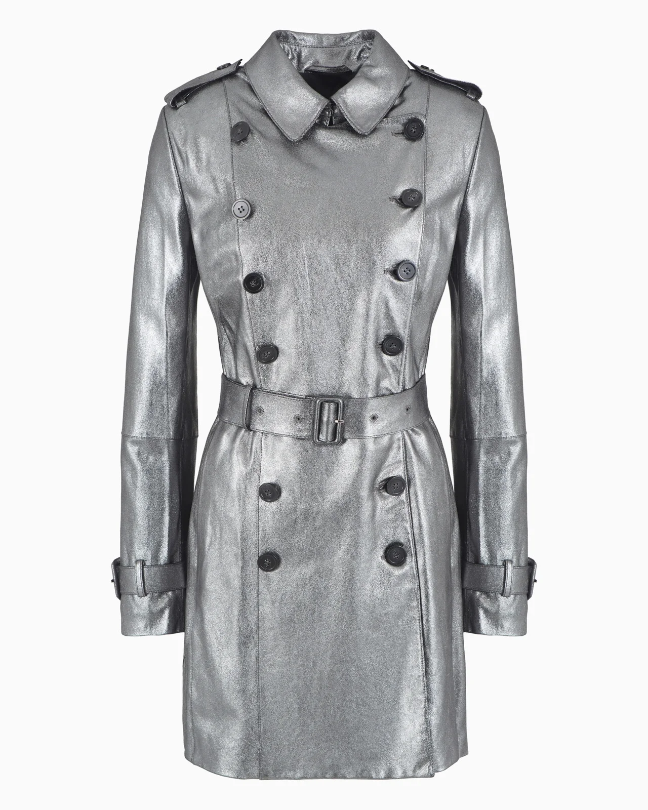Double-breasted trench coat with a matching belt at the waist made of goatskin suede. The application of a layer of metallic foil gives the skin a striking metallic effect that illuminates the piece and every outfit it completes. Product Code: EW000146AF104131L8168 Details Composition 100% Goat skin Metallic suede Classic collar Double-breasted Faux-horn buttons Shoulder epaulettes Long sleeves Strap and buckle cuffs Waist belt with leather-covered buckle Side pockets Slit at the back Stretch-serge lining Fitting The model is 178 cm tall and is wearing size 40/S (Italian Size)