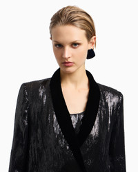 Double-breasted blazer with shawl lapels, entirely encrusted with bright sequins. The style is embellished with velvet details used for the lapels and pockets. A piece to let you shine on the most special occasions. All-over sequins Double-breasted Neckline with velvet shawl lapels Long sleeves Button cuffs Velvet side pockets Slit at the back Satin lining Product Code: EW001352AF14321UC001