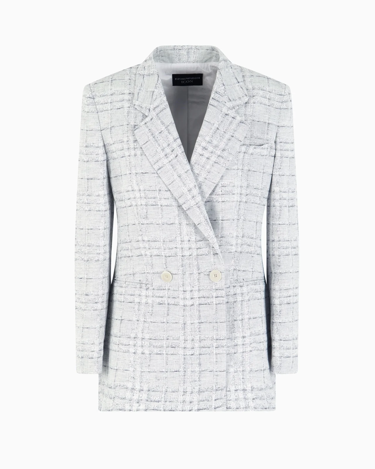 Double-breasted blazer with a lapel collar, made of a fresh and lightweight cotton and linen blend fabric. The style features an all-over check motif that enhances the exclusiveness of the garment. This style is part of the Icon capsule collection: the essence of Emporio Armani, providing a modern interpretation of the brand’s DNA by updating the iconic shapes and volumes of its past, aimed at affirming a classic, evergreen allure. Check motif Double-breasted Lapel collar Long sleeves Button cuffs Double-welt side pockets Two back vents Voile lining Product Code: EW000982TE13533F1013