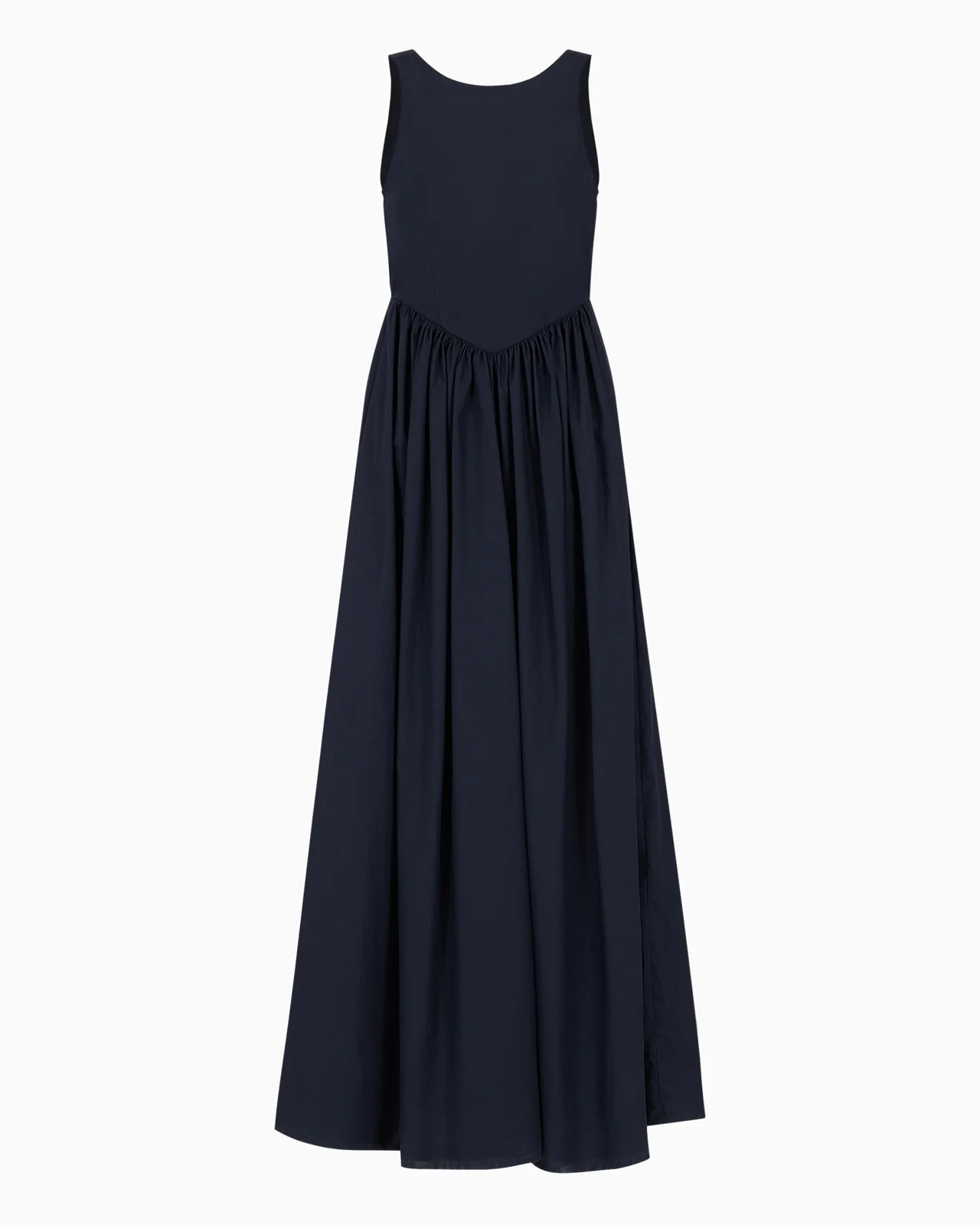 Long, sleeveless dress with flared design that adds dimension to the skirt. The gathering highlights the waistline, creating a series of vertical pleats that give the garment movement. Made from crisp pure cotton poplin, it adds a summery touch to every look, while the minimalist design confirms its modern attitude. Product Code: 3D2A732N0FZ10926 Details Composition 100% Cotton Poplin Rounded neckline Sleeveless Gathered waist Invisible zip on the left side Deep round neckline at back Fitting The model is 178 cm tall and is wearing size 40/S (Italian Size)
