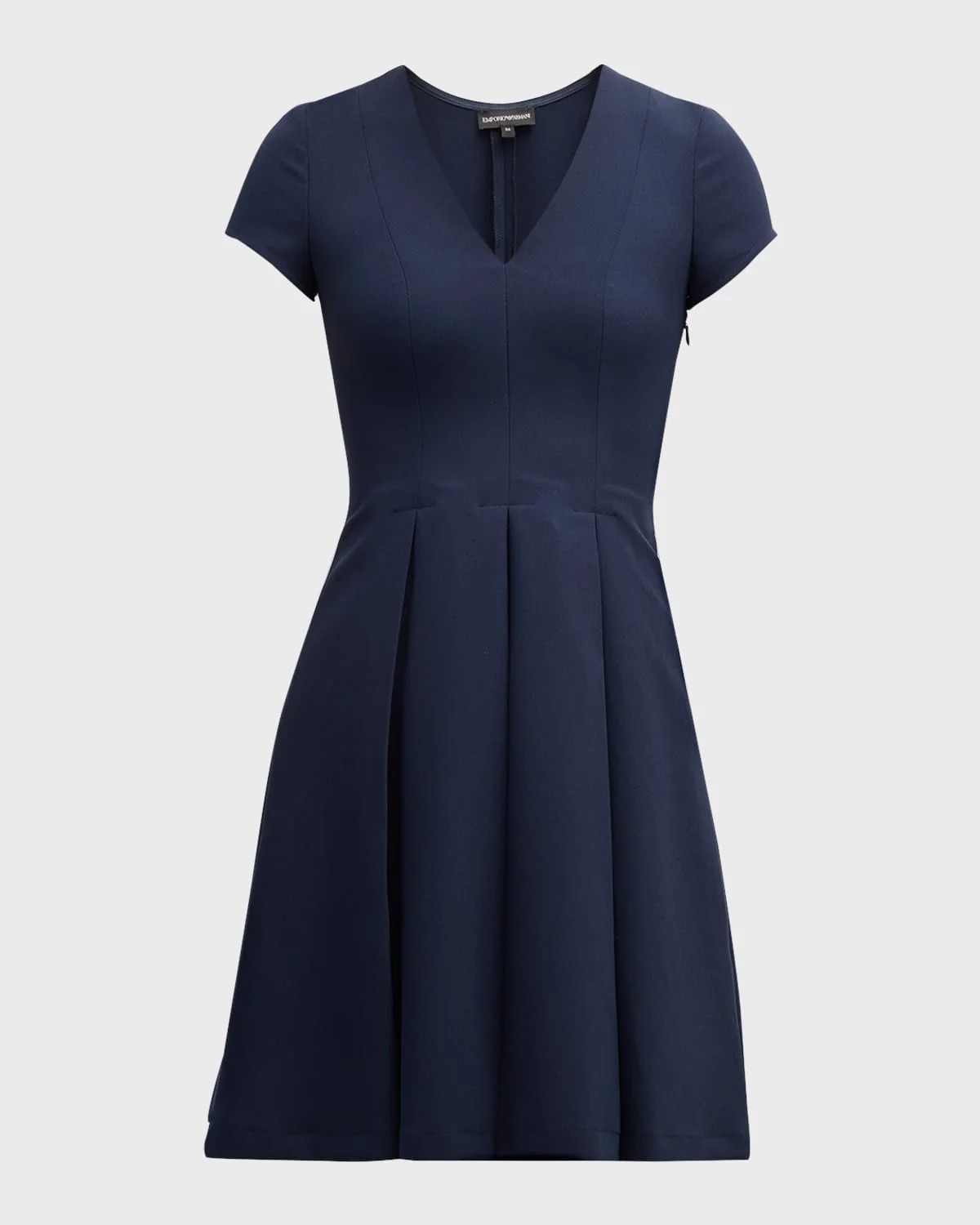 - Emporio Armani "Emma" pleated mini dress - V neckline - Short sleeves - Hem falls above the knee - A-line silhouette - Invisible side zipper - Polyester/viscose/elastane - Dry clean - Imported - Model is 5'10"/177cm. - Size Note: Item runs small, consider ordering a size up.