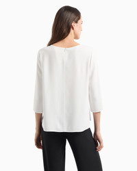 Made of flowing fabric, this blouse gently drapes across the body’s shape and is designed to meet the demands of the multi-tasking modern woman who always requires an impeccable look. The piece belongs to the Essentials selection, the Emporio Armani capsule collection that makes a statement of enduring style: both elegant and practical, it works for numerous combinations on a wide array of occasions. The colour palette includes the brand’s characteristic neutral shades, combined with a minimalist design to create a series of key pieces for the female wardrobe. Product Code: 0NK3AT020031101 Details Composition 70% Acetate 30% Viscose Envers satin Rounded neckline Three-quarter sleeves Half zip and concealed back zip Unlined garment Made in Italy Fitting The model is 178 cm tall and is wearing size 40/S (Italian Size)