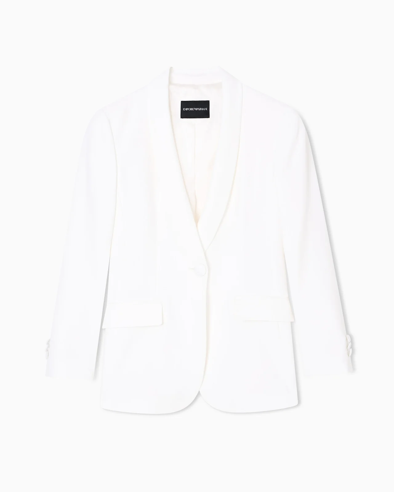 This jacket, made of flowing envers satin, gently follows the silhouette. Designed for the multi-tasking modern woman who requires an impeccable look. Domed button closure and satin-lined. The piece belongs to the Essentials selection, the Emporio Armani capsule collection that makes a statement of enduring style: both elegant and practical, it works for numerous combinations on a wide array of occasions. The colour palette includes the brand’s characteristic neutral shades, combined with a minimalist design to create a series of key pieces for the female wardrobe. Product Code: 0NG3DT020031101 Details Composition 70% Acetate 30% Viscose Envers satin Single-breasted Shawl collar Closure with satin-covered dome button Side welt pockets with flap Satin welts Long sleeves Button cuffs Satin lining Fitting The model is 178 cm tall and is wearing size 40/S (Italian Size)
