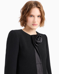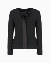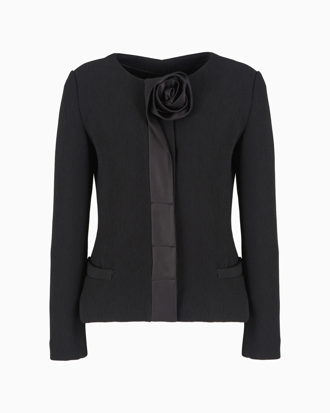 Jacket made of stretch technical fabric with a particularly textured weave created by the embossed ribs that result in a unique, dense wave-effect motif. The satin trim on the front is embellished with a rose-shaped flower detail applied at the neck. Product Code: EW000090AF102361UC001 Details Composition 96% Polyester 4% Elastane Stretch technical fabric Ribbed weave Crew neck Press-stud closure Satin closure trim Applied satin flower Long sleeves Satin lining Fitting The model is 178 cm tall and is wearing size 40/S (Italian Size)