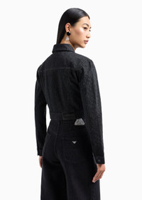 Cropped jacket made from cotton denim. The logo is not explicit, but still remains the decorative star: a storm of rhinestones designs a very dense pattern with an all-over EA logo, creating a myriad of bright, sparkling highlights. Product Code: 6D2B812DULZ10005 Details Composition 100% Cotton Denim All-over rhinestone logo Classic collar Front buttoning Logo buttons Front pockets with flap and button Matching stitching Leather tag at the back Fitting The model is 178 cm tall and is wearing size 40/S (Italian Size)