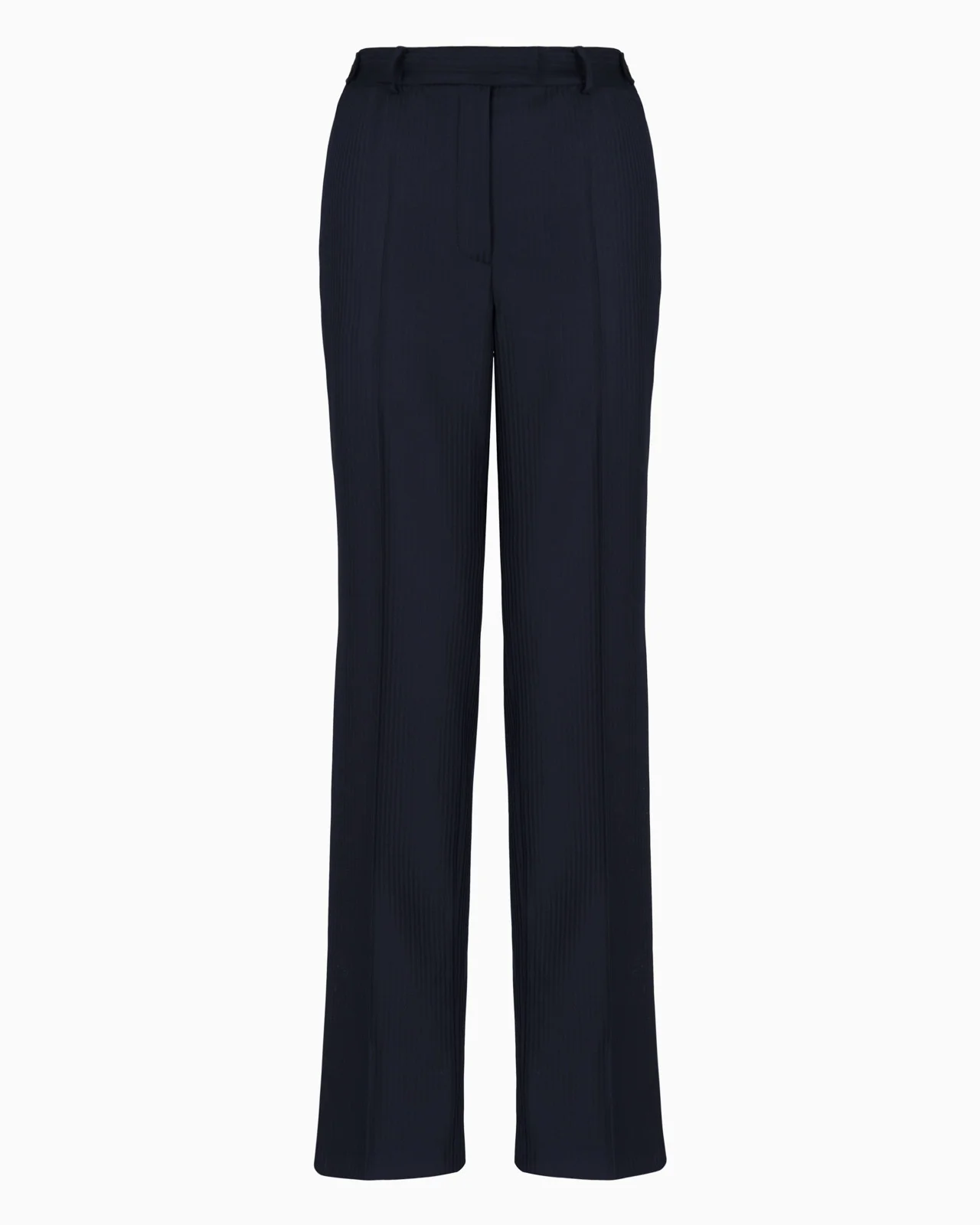 Menswear-inspired trousers with a front pleat, made of pure virgin wool satin with a striped motif. A formal piece that to layer and mix with different patterns. Product Code: EW001089TE121681UB109 Details Composition 99% Virgin Wool 1% Elastane Ankle cuffs: 21 cm Wool satin Alternating stripes motif Waist with belt loops Off-centre zip and strap closure Front pleat Side pockets Back double-welt pocket