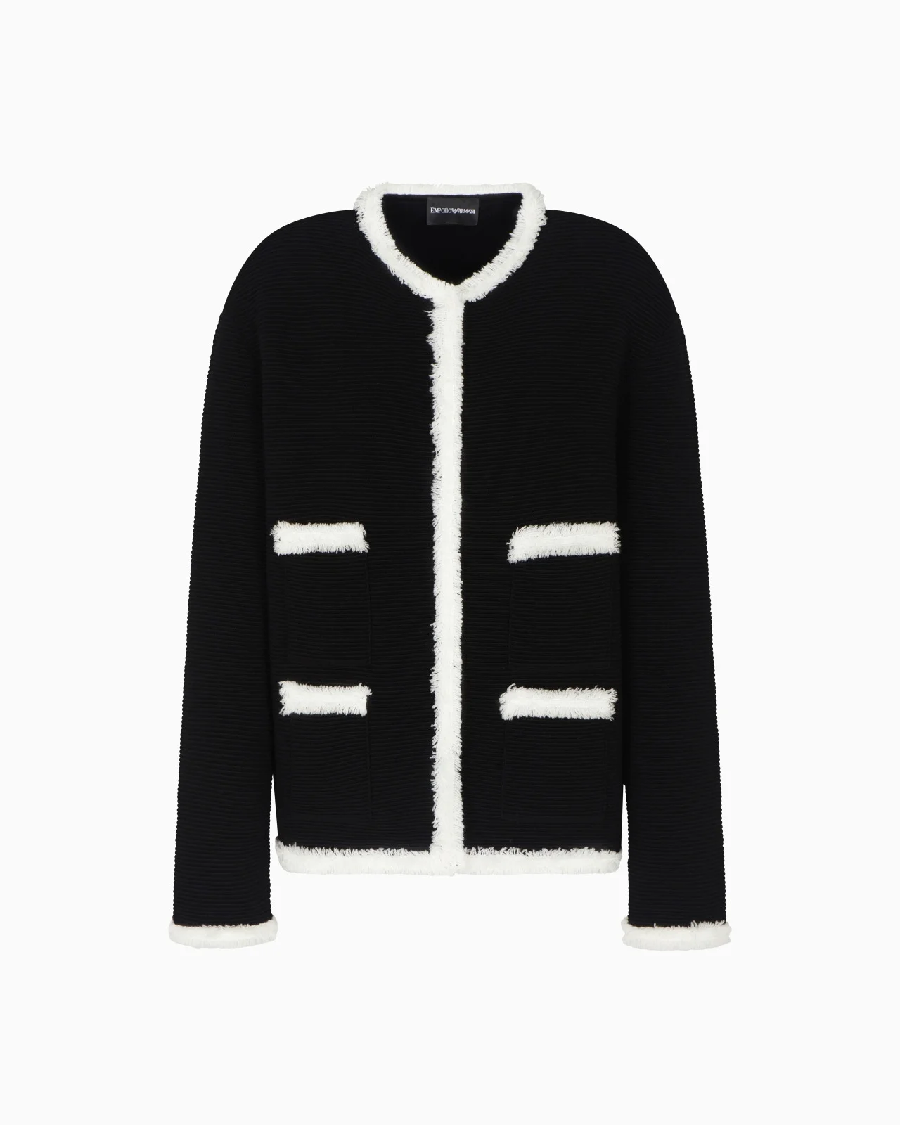 Crew-neck jacket with press-stud closure, made of ottoman fabric, woven with all-over sophisticated embossed ribs, making it exclusive and adaptable to multiple outfits. The style is embellished with s fringed trim detail that distinguishes the garment. Ottoman fabric Crew neck Press-stud closure Long sleeves Patch pockets Fringed edges Product Code: EW001215AF18159MC006