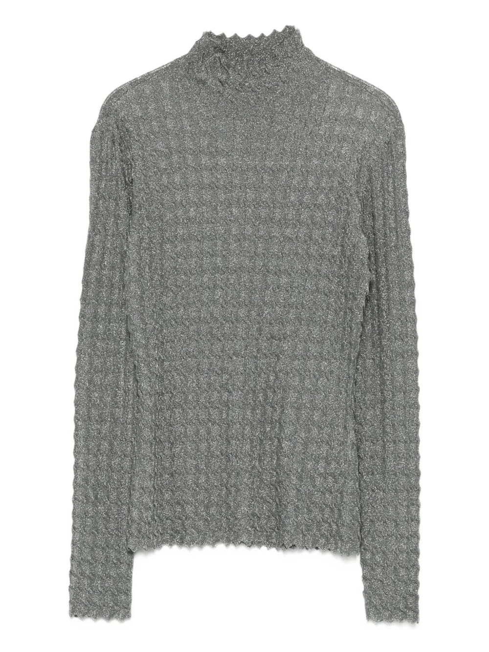 high-neck textured sweater Highlights Imported Composition Viscose 85%, Polyester film fiber 15% SIZE & FIT Model measurements Height 5 ft 9 in(1.76 m) Bust/Chest 31.49 in(80 cm) Hips 35.43 in(90 cm) Waist 23.62 in(60 cm)