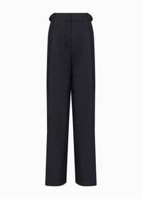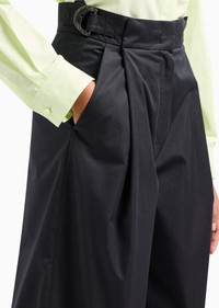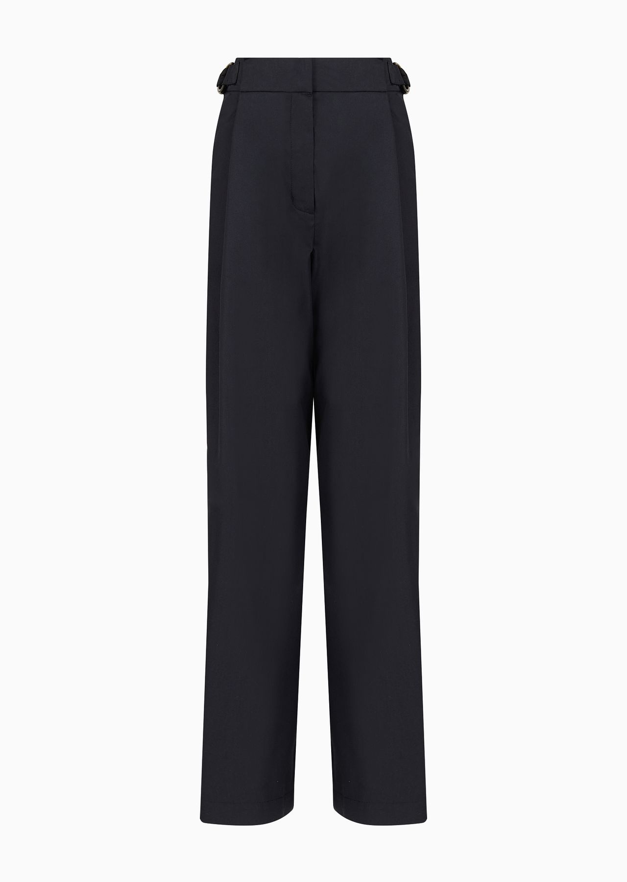 Particularly high-waisted trousers made from a cotton blend with a percentage of technical yarn that makes them modern and current. Stitched darts help enhance the fit and, starting at the waist, add a slight flare to the leg. These minimalist, form-fitting trousers are perfect from morning to evening. Product Code: 3D2P692NW9Z10927 Details Composition 80% Cotton 20% Polyester Cotton blend Hook clasp Metal rings at the sides Side pockets Fitting The model is 178 cm tall and is wearing size 40/S (Italian Size)