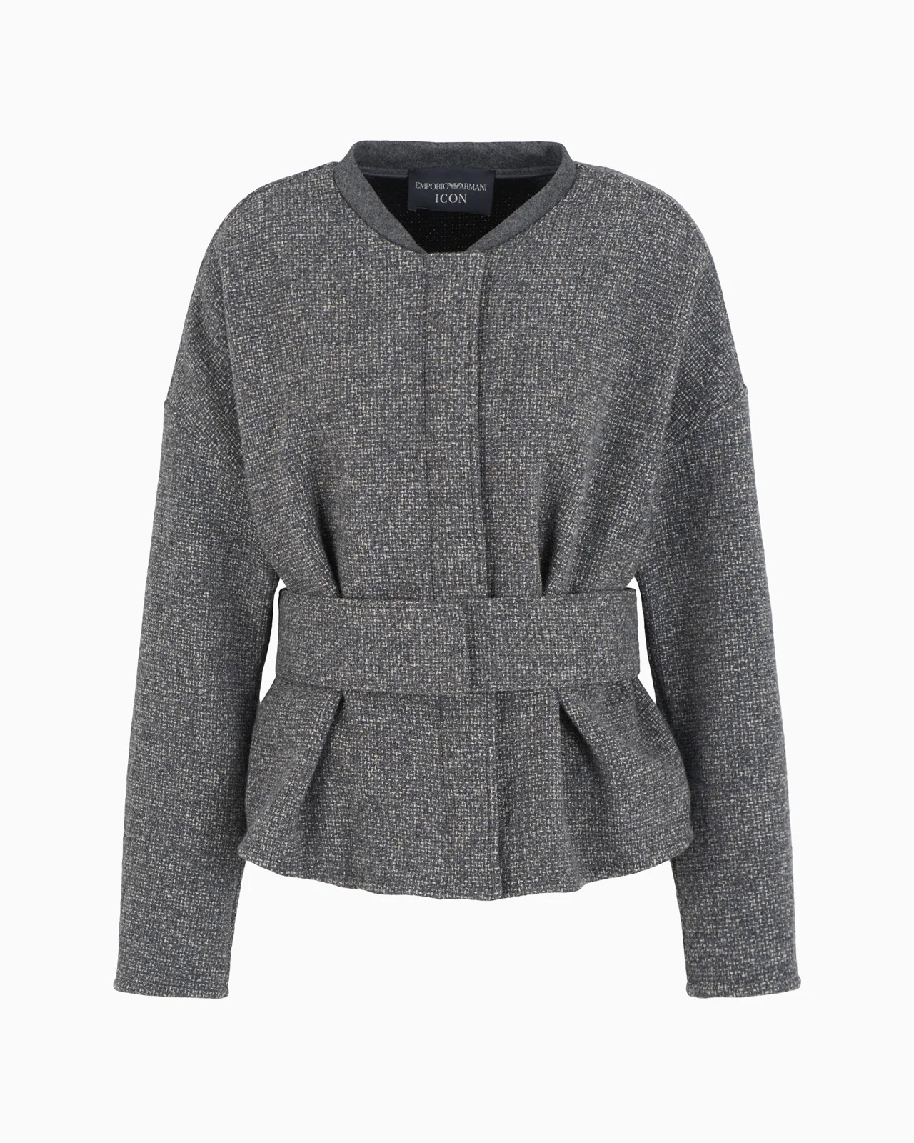 Jacket made of a wool blend basketweave, a thick fabric with a woven texture similar to panama, with darts on the front and back and a matching high-waisted belt. This piece is part of the Icon capsule collection: the essence of Emporio Armani, providing a modern interpretation of the brand’s DNA by updating the iconic shapes and volumes of its past, aimed at affirming a classic, evergreen allure. Product Code: EW000157TE105191O8003 Details Composition 70% Wool 25% Polyamide 5% Other Fibres Basketweave fabric Concealed zip closure Front and back darts Long sleeves High-waisted belt with press studs Unlined garment Fitting The model is 178 cm tall and is wearing size 40/S (Italian Size)
