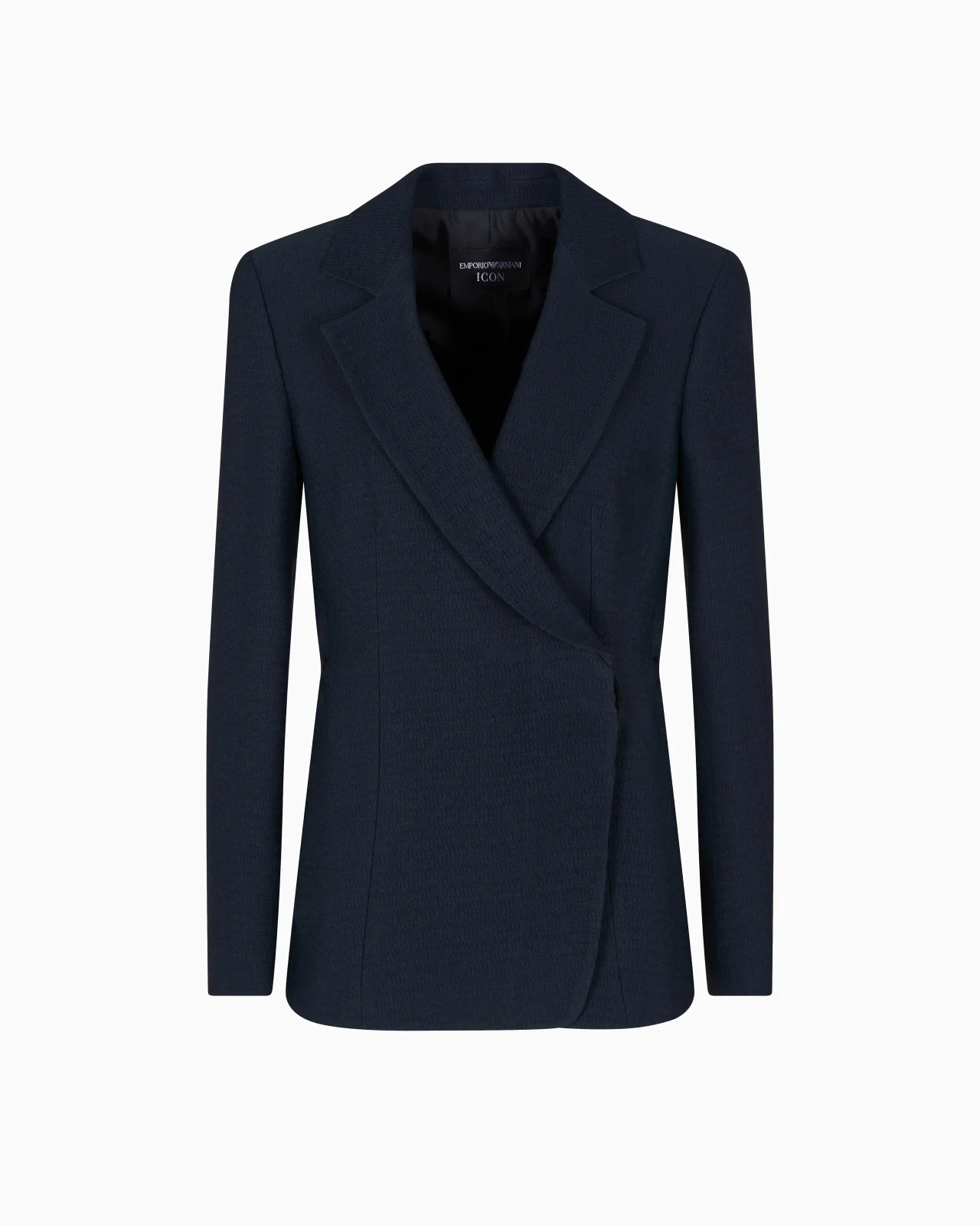 Blazer with rounded lapels on the neckline, made of a fluid armure fabric. The garment is fresh and comfortable and features an off-centre wrap-effect closure: the practical inner strap is inserted through the side slot and then secured by a button. The garment is part of the Icon capsule collection. Flowing armure fabric Lapel collar Off-centre closure with strap and internal button Long sleeves Satin lining Product Code: EW002231TE15812FB212