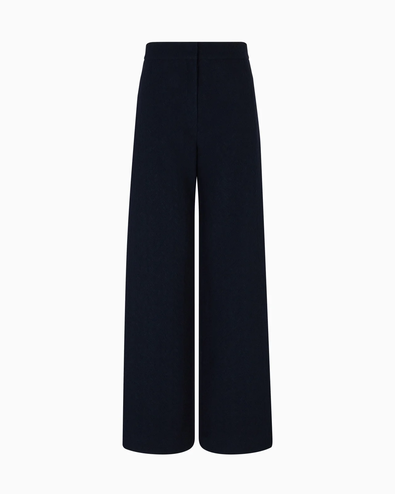 High-waisted trousers with a wide-leg, made of a virgin wool blend and embellished with the signature chevron motif, which has a sophisticated embossed look thanks to the expertly crafted jacquard that runs across the entire style, enhancing its exclusive allure. The garment is part of the Icon capsule collection. Jacquard Chevron motif High waist with belt loops Closure with zip, hook and back button Side pockets Back welt pocket Product Code: EW002234TE15811FB046