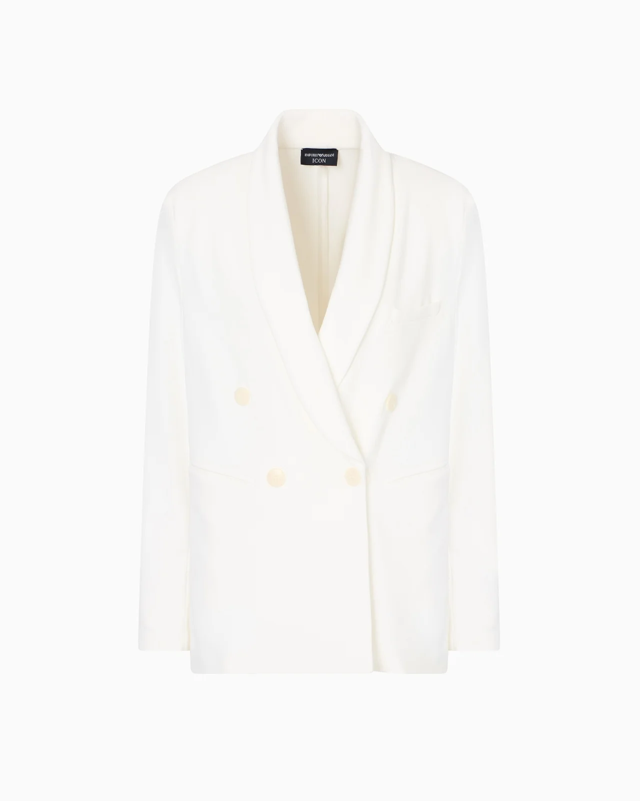 Double-breasted blazer with shawl lapels, made of a compact pique in a stretch viscose blend. Fresh, draped pique fabric brings understated elegance to everyday clothing. This style is part of the Icon capsule collection: the essence of Emporio Armani, providing a modern interpretation of the brand’s DNA by updating the iconic shapes and volumes of its past, aimed at affirming a classic, evergreen allure. Pique Double-breasted Neckline with shawl collar Long sleeves Button cuffs Double-welt side pockets Unlined garment Product Code: EW001122AF13314U0001