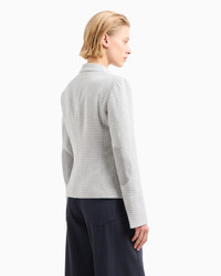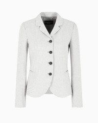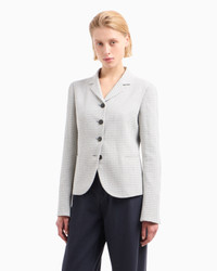 Jacquard fabric single-breasted jacket with lapel collar. The piece features a weave with a timeless all-over houndstooth motif that creates a two-tone effect. The sleeves are embellished with suede-effect patches at the elbow. This style is part of the Icon capsule collection: the essence of Emporio Armani, providing a modern interpretation of the brand’s DNA by updating the iconic shapes and volumes of its past, aimed at affirming a classic, evergreen allure. Houndstooth Single-breasted Lapel with suede-effect undercollar Button closure Long sleeves Suede-effect patches Cuffs with slits Side welt pockets Peplum at the hem Muslin lining Product Code: EW000987TE12253FZ007
