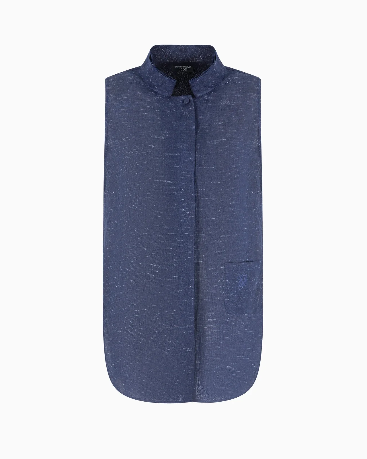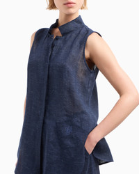 Oversized top with an iconic guru collar and diagonal panel detail on the back, made of a linen-blend chambray. Chambray is an extremely fresh, lightweight fabric that takes on a slight two-toned look from the different colours of the weave and warp. It looks very similar to denim, but its softer texture and thinner construction make it the perfect material for spring and summer apparel. This piece is part of the Icon capsule collection: the essence of Emporio Armani, providing a modern interpretation of the brand’s DNA by updating the iconic shapes and volumes of its past, aimed at affirming a classic, evergreen allure. Chambray Sleeveless Concealed buttoning Patch pocket on the side Embroidered logo Unlined garment Product Code: EW000996TE10381OB005
