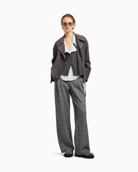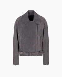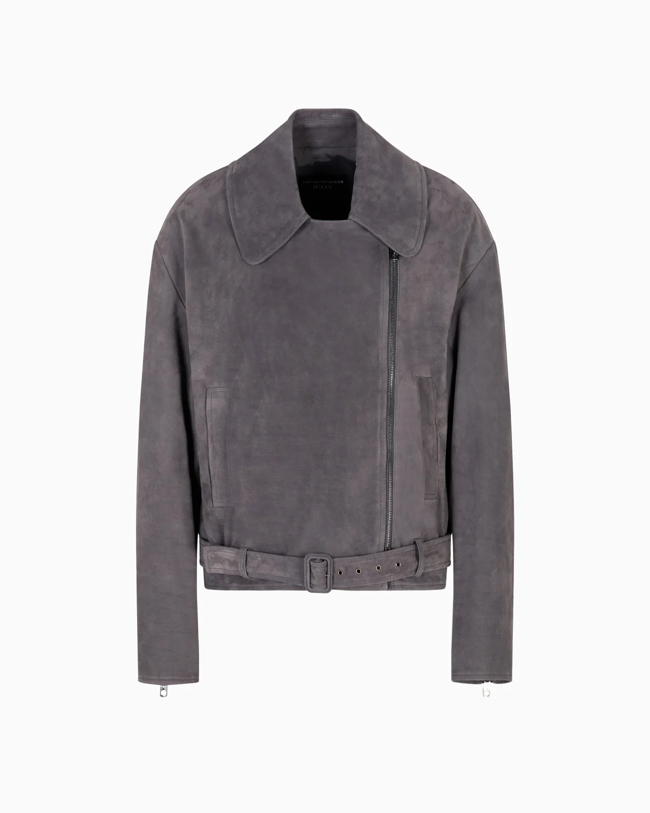Oversized biker jacket with diagonal off-centre zip fastening and matching belt at the hem. The piece is made of nubuck calf leather that is obtained by carefully skimming the grained part of the leather. As it is a natural grain, there may be slight indentations typical of nubuck, so any irregularities should be taken as characteristic features of the item. The garment is part of the Icon capsule collection. Oversized fit Nubuck Biker style Classic collar Diagonal zip Side pockets with press studs Long sleeves Matching elbow patches Zip cuffs Fixed belt with buckle Serge lining Product Code: EW002158AF18877U8082
