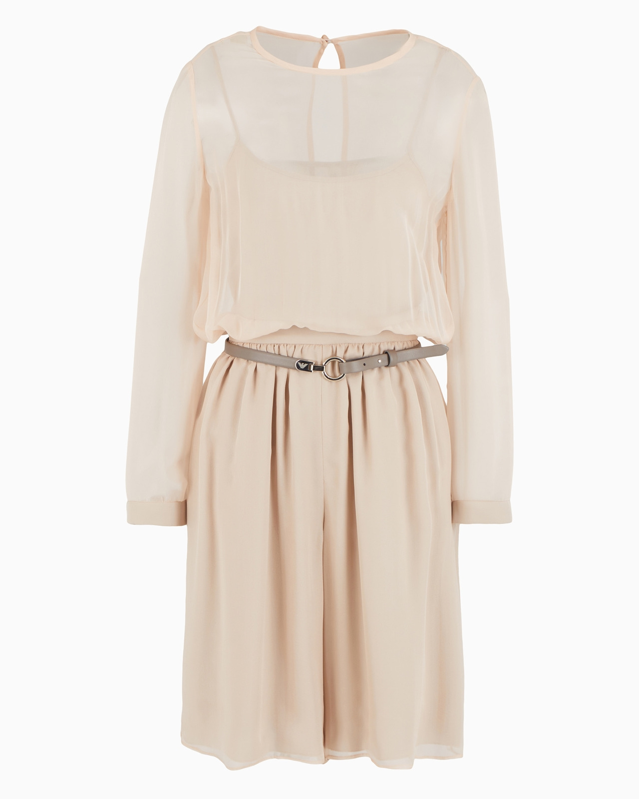 Two piece-effect short jumpsuit made of pure silk, with a sheer georgette top and culotte-effect lower part. This piece is part of the Icon capsule collection: the essence of Emporio Armani, providing a modern interpretation of the brand’s DNA by updating the iconic shapes and volumes of its past, aimed at affirming a classic, evergreen allure. Product Code: EW000175AF104371M4001 Details Composition 100% Mulberry silk Silk chiffon and georgette Rounded neckline Long sleeves Leather belt included Side pockets Back zip closure Domed button closure at the back of the neck Back opening Removable inner top as lining Fitting The model is 178 cm tall and is wearing size 40/S (Italian Size)