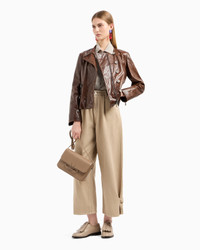 Fitted jacket made of vegetable-tanned goatskin nappa leather with a pull-up effect, a treatment that gives the tanned leather the special feature of lightening at the points of wear. The piece is tumbled and embellished with contrasting piping on the pocket zips and cuffs. This piece is part of the Icon capsule collection: the essence of Emporio Armani, providing a modern interpretation of the brand’s DNA by updating the iconic shapes and volumes of its past, aimed at affirming a classic, evergreen allure. Product Code: EW000208AF105081U6068 Details Composition 100% Goat skin Nappa leather Tumbled finish Off-centre closure with zip and buttons Zipped front pockets Long sleeves Zip cuffs Exclusive cashmere-blend lining Stretch serge lining in the sleeves Fitting Slim fit The model is 178 cm tall and is wearing size 40/S (Italian Size)