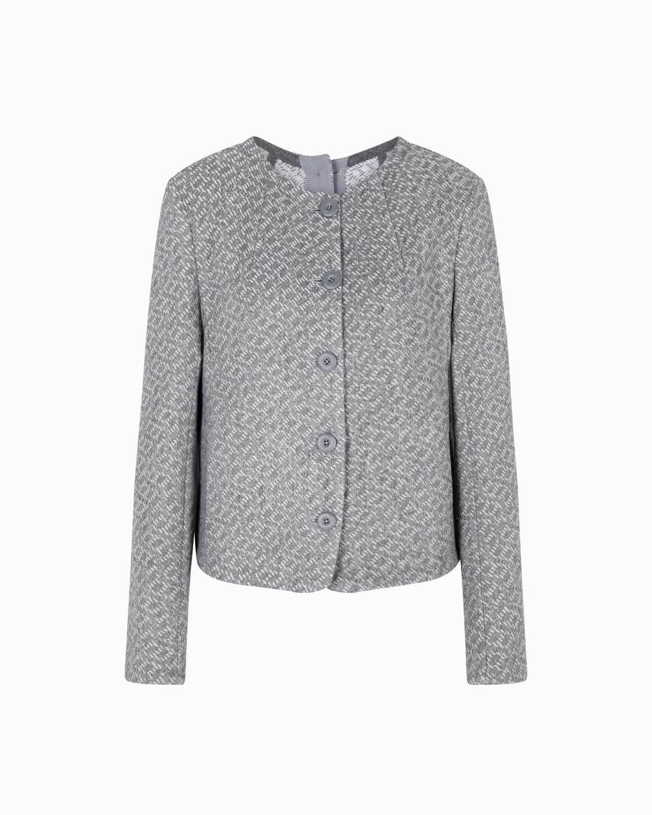 Single-breasted, crew-neck jacket made of a jacquard knit. The tricot-effect weave embellished with a distinctive micro-pattern is the distinctive feature of this style making it unique and sophisticated. The garment is part of the Icon capsule collection. Jacquard Tricot effect Single-breasted Front button closure Long sleeves Unlined garment Product Code: EW002227TE15788F8026
