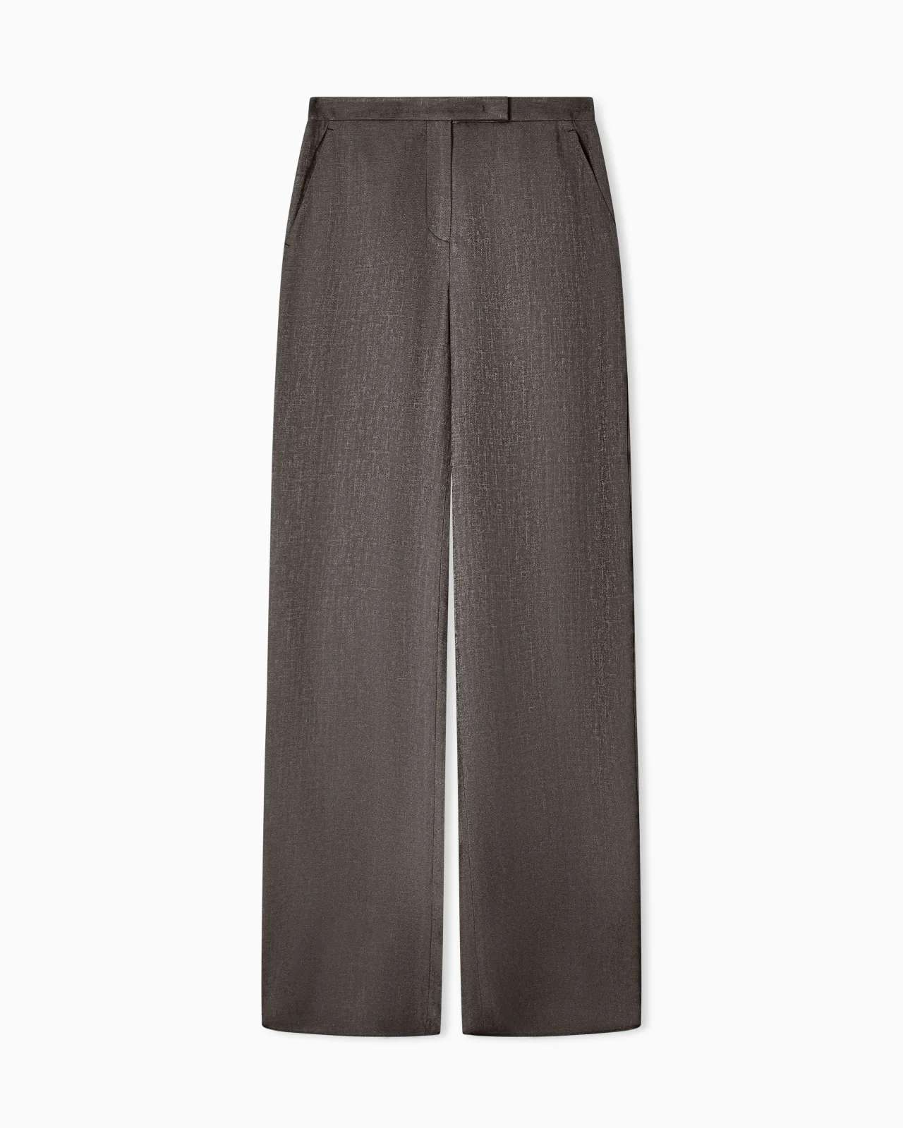 Trousers made of pure viscose fabric with an armure-weave base embellished with a jacquard that gives the texture a slightly iridescent effect. The garment is part of the Icon capsule collection. Length: 118 cm Ankle cuffs: 25 cm Armure weave Jacquard Off-centre waistband Inner waist with ottoman trim Front concealed zip fastening Serge side pockets Twill edging Unlined garment Product Code: EW003756TE18978F6007