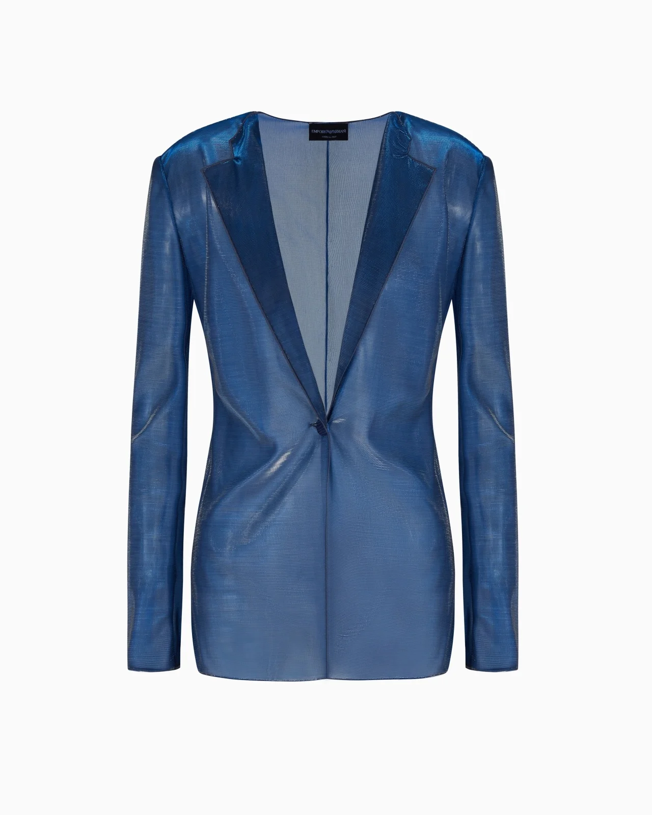 Blazer with lapels at the neckline, featuring a modern, deconstructed silhouette. Made of an iridescent knit fabric that adds a luxurious touch to the piece thanks to its natural sheer and shiny effect that creates numerous highlights. The piece is further finished with matching piping. In a style that evolves yet stays true to its essence, this boldly coloured piece stands out for its fluidity and sophistication. Iridescent knit fabric Lapel collar One-button closure Long sleeves Piped trim Tulle lining Product Code: EW001723AF15194FB020