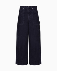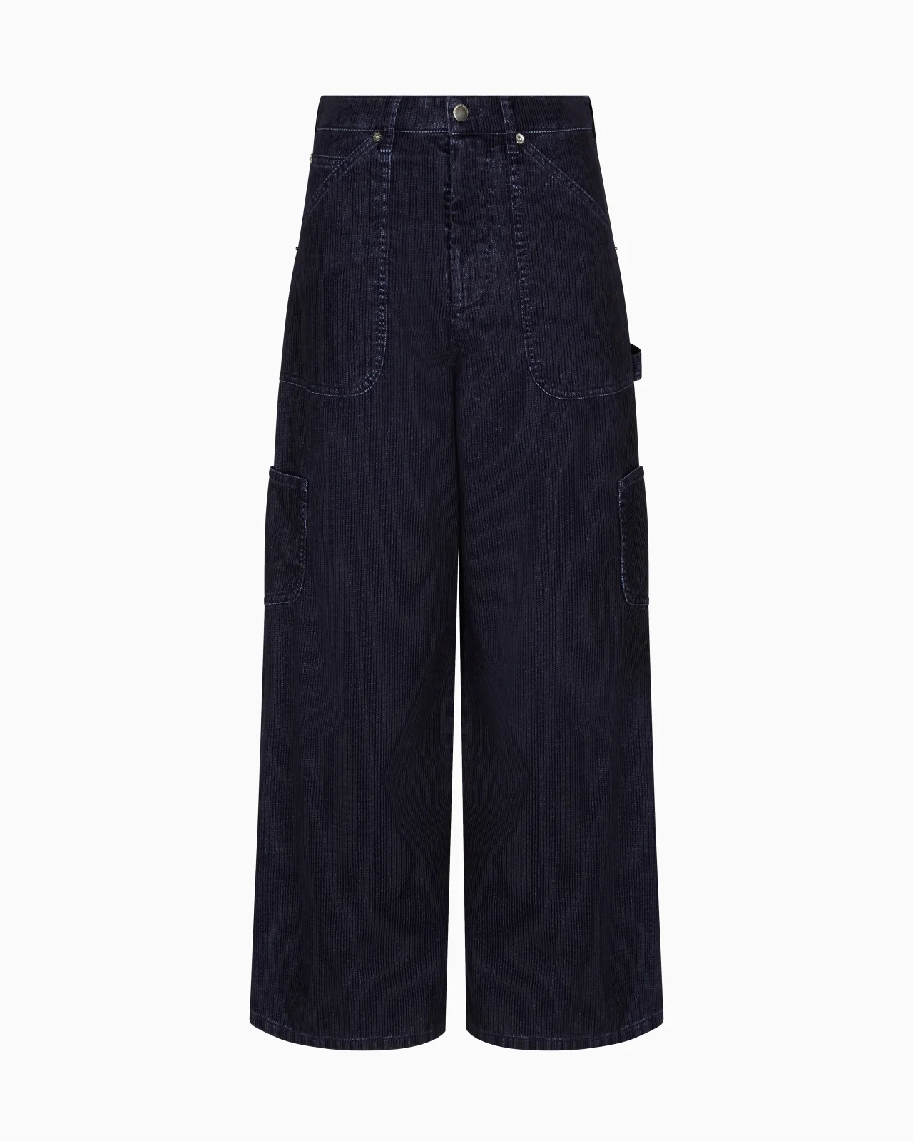 Mid-rise, wide-leg cargo-style jeans with press studs to adjust the width at the ankles. The piece is made from pure cotton drill with signature patch pockets on the sides. It is a very sturdy woven fabric, featuring small visible ribs and similar to denim in terms of weight and durability. The style featuring a garment-dyed wash, which gives a fresh, exclusive appearance, is also embellished with a distinctive embossed effect with a velvety feel created by the flocked fabric that adds a distinctive touch. Drill Flocked Garment dyed Cargo style Mid-rise waist with belt loops Wide leg Zip and button closure Side patch pockets Leather logo tag Back eagle plate Ankle hem with press studs Product Code: EW002057AF16418UB115