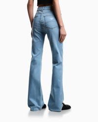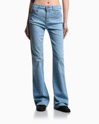Mid-high rise jeans with a flared hem, made from a stretch cotton and Lyocell blend denim and customised with a suede logo jacron on the back. A garment that is both seductive and new in spirit. Slim fit. Slim fit Waist with belt loops Five pockets Zip and button closure Flared hem Suede jacron with logo Laser-cut logo on the back Product Code: EW000963AF12677MB002