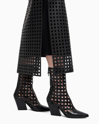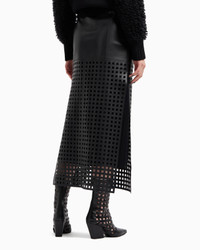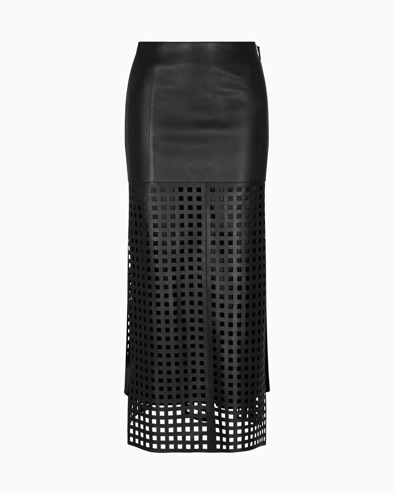 Midi skirt with wide side slits made of vegetable-tanned lambskin nappa leather using tannin extracted from olive leaves, a vegetable tanning process that gives the leather a rugged look and natural sheen. The style is embellished with a laser-cutting process that creates a dense, perforated check collection motif: to create the design of the squares, whole skins are then roughly cut and then laser cut using a specific program, leaving the necessary margins for raw-cut stitching. The item is part of this season’s new Polygon capsule collection, where vertical lines and geometric cut-outs capture the essence of a modern, elegant design. An offering that exudes post-modernist vibes, creating a perfect balance between functionality and aesthetic harmony: structured and refined creations are developed in melange grey tones that go hand in hand with the warmest undertones of burgundy. Regular fit Length: 91 cm Vegetable-tanned nappa leather Side zip closure Laser cut Side slits Serge lining Product Code: EW002800AF19288UC001