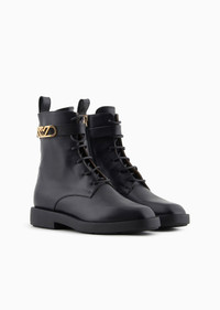 Lace-up ankle boots in calfskin with a reinterpreted cavalry-style design. This footwear belongs to the Icon capsule collection: the essence of Emporio Armani, providing a modern interpretation of the brand’s DNA by updating the iconic shapes and volumes of its past, aimed at affirming a classic, evergreen allure. Product Code: EW000423AF119911UC001 Details Composition 100% Calf-skin leather Leather Lace-up fastening Inner side zip Logo strap Pull tab at the back Rubber soles Made in Italy