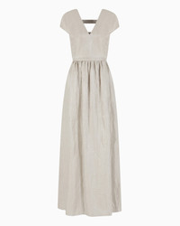 Long dress with a V neck, short sleeves and two practical side pockets, made of crisp linen with a shiny finish that adds a natural sheen to the piece. Dress with a feminine design and fluid texture that your can wear effortlessly from day to night: the skirt with pleats that create movement and a signature cut-out neckline at the back elevate the sophisticated nature of the style. Length: 145 cm Linen V neck Short sleeves Side pockets Skirt with darts and pleats Invisible side zip fastening Back V neck Grosgrain cut-out detail Elasticated back waist Unlined garment Product Code: EW001744TE14311U8011