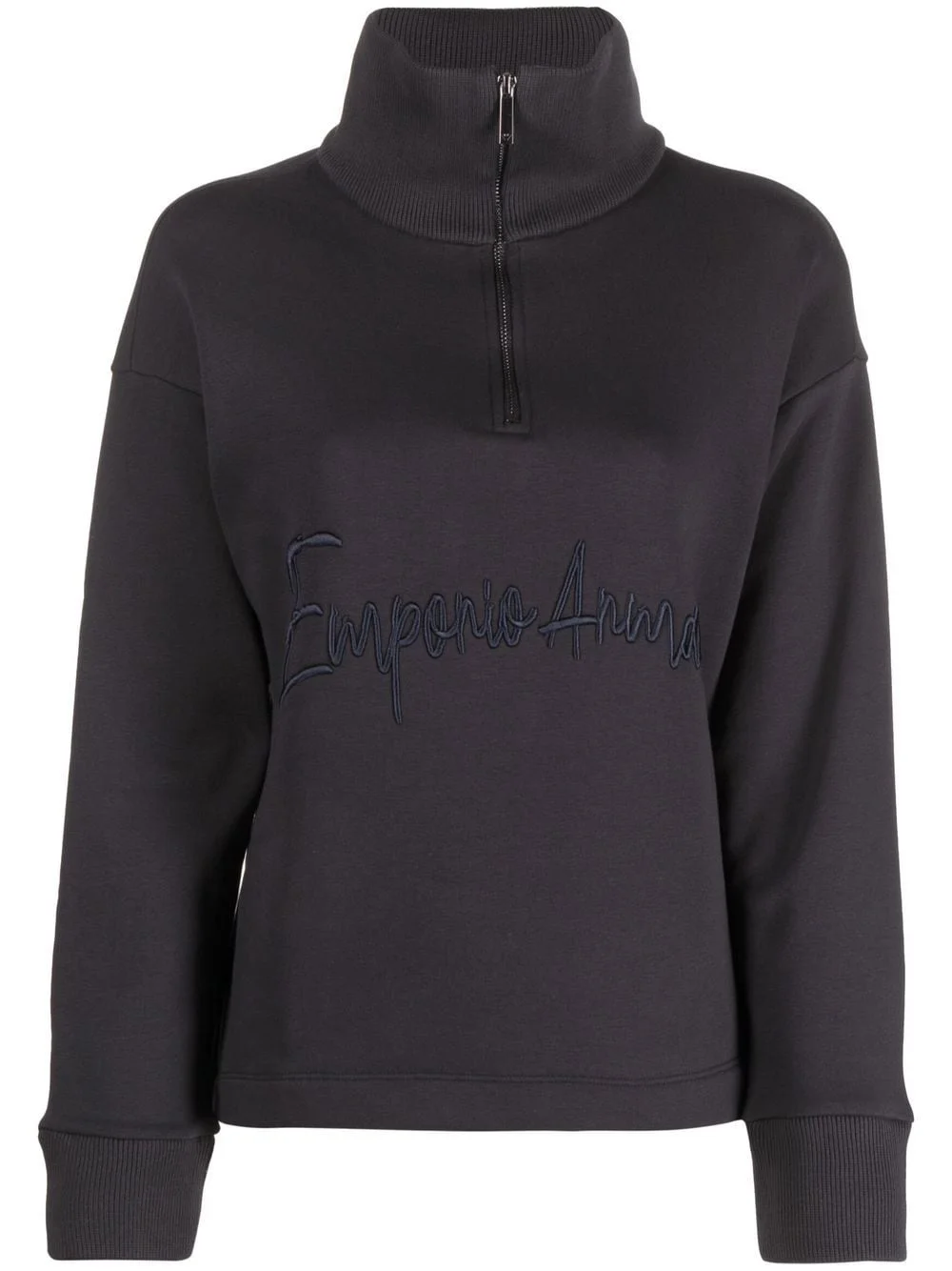 logo-embroidered quarter-zip sweatshirt Emporio Armani presents this navy blue cotton-blend sweatshirt as part of the label's latest collection. It is detailed with a quarter-zip front fastening and a tonal embroidered logo across the chest. Imported Composition Cotton 64%, Polyester 36% SIZE & FIT Model measurements Height 5 ft 10 in(1.78 m) Bust/Chest 30.31 in(77 cm) Hips 36.61 in(93 cm) Waist 24.8 in(63 cm) FittingInformation This piece fits true to size. We recommend you get your regular size Cut for a relaxed fit Made with a mid-weight fabric