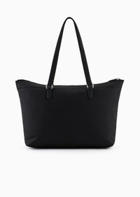 Shopper bag made of certified recycled nylon with double handle and zip fastening. Essential lines and plaques featuring the iconic metal eagle characterise this line of functional accessories, which are made from recycled material in line with the brand’s desire for an increasingly sustainable approach. Product Code: Y3D279YWS1E180001 Details Composition 100% Polyamide The main fabric features 50% recycled polyamide Measurements: 35 x 29 x 13.5 cm Recycled nylon Eagle plaque Zip closure Two handles